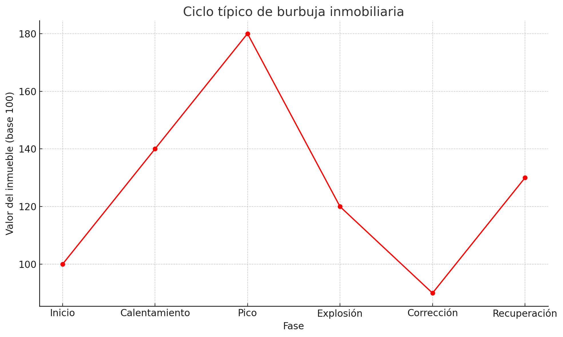 Gráfico: Ciclo típico de burbuja inmobiliaria (calentamiento, explosión, corrección) ✅
